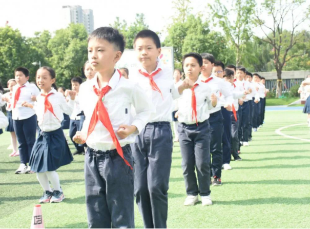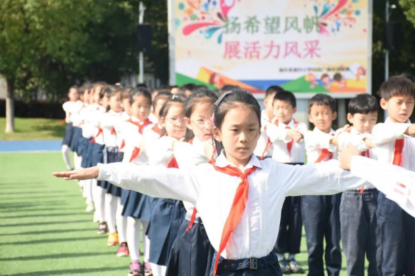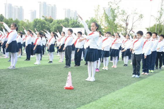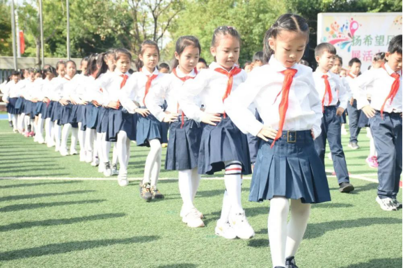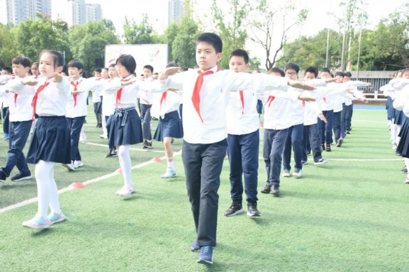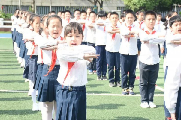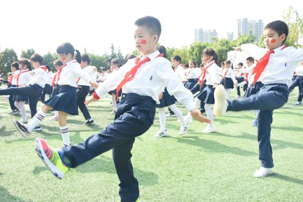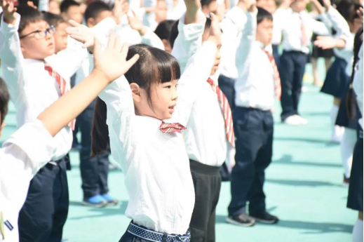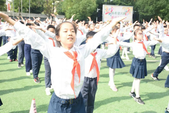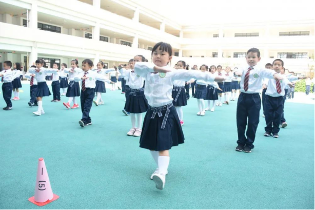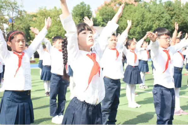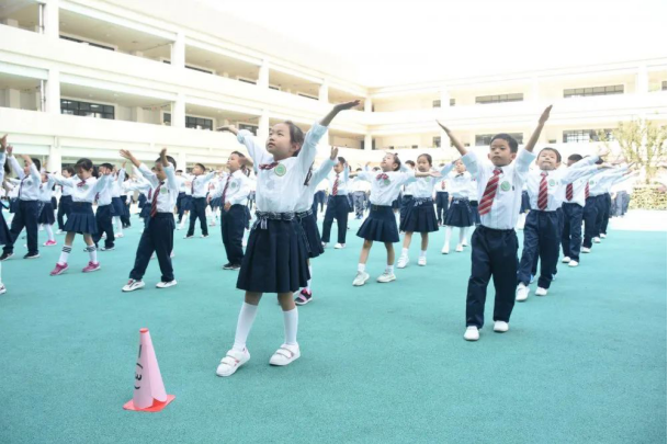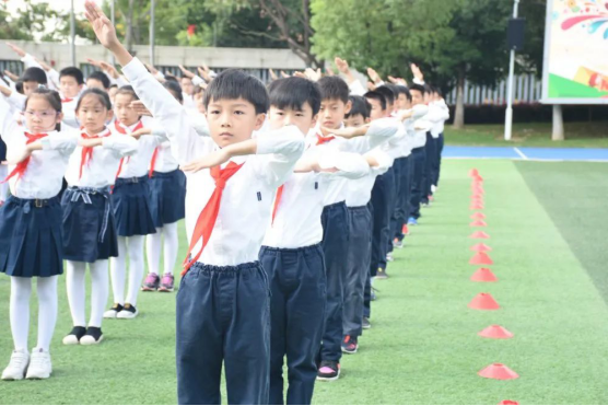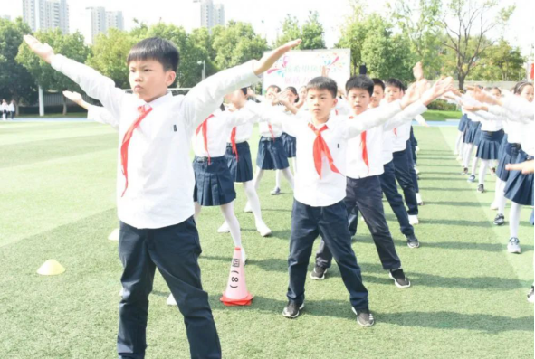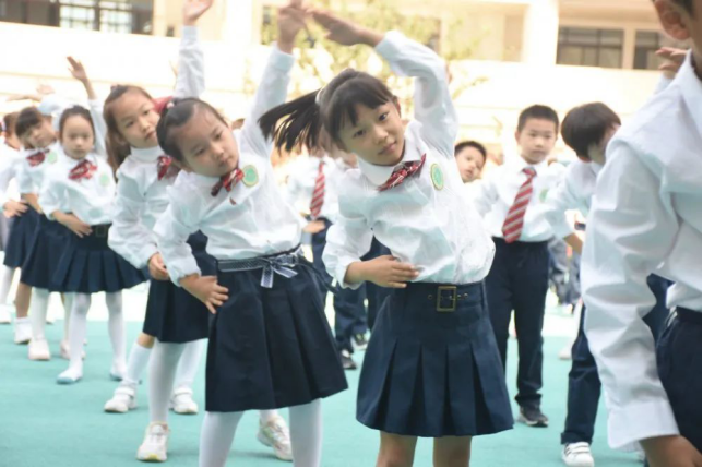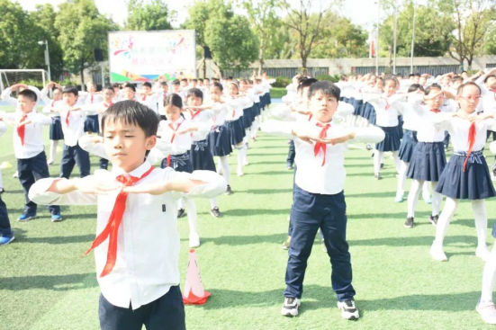本届比赛以年级为单位,37个班的孩子们分5批依次登场。他们精神十足,活力无限,举手、弯腰、抬脚、转身、跳跃……每个动作都整齐规范。