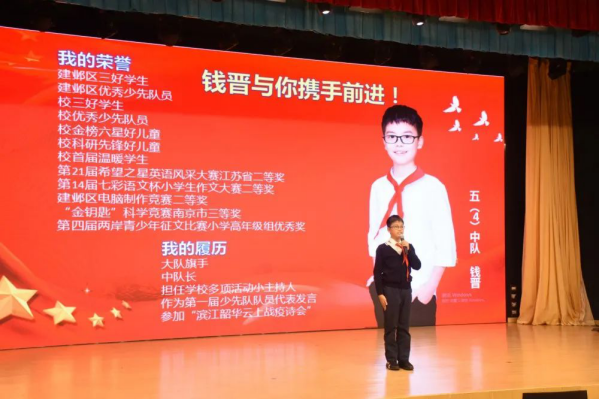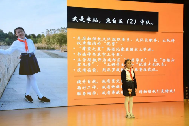10月21日,45位候选人在小剧场进行了现场演讲。本场活动由大队辅导员徐彤彤老师主持,全程直播。候选队员们个个自信满满,神采飞扬,言语间满是对队工作的热情与向往。他们通过演讲的方式向大家展示自己的综合素质,其中包括自我介绍、对竞选职务的认识、自身优势及兴趣特长等。他们精彩地展示赢得了台下队员们的阵阵掌声。