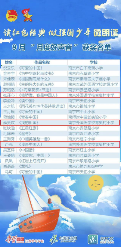 在这个收获的季节,我校张译心、薛昊宸、卢骁三名同学在“学习强国”平台推出的“读红色经典 做强国少年”微朗读活动中获得了9月“月度好声音”的光荣称号。