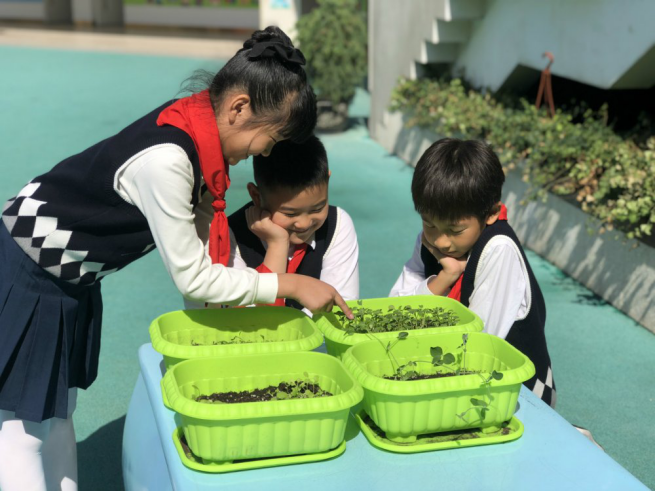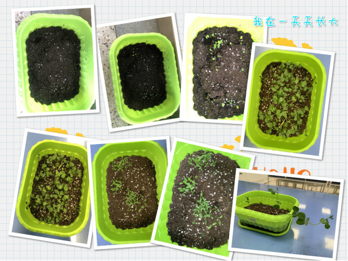 让我们再来看看科学教室外的“小菜园”,一个月前香菜、小白菜、豌豆尖、樱桃萝卜还在泥土里休眠,经过大家的悉心照料,现在的它们纷纷冒出了芽儿,真期待它们成熟的那一天,想尝一尝它们的滋味!
