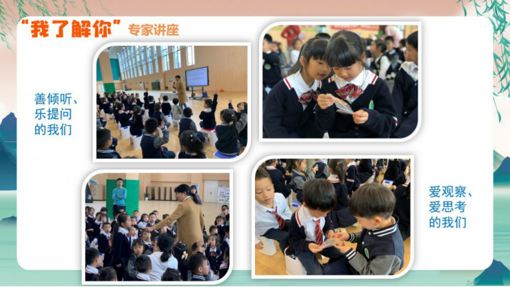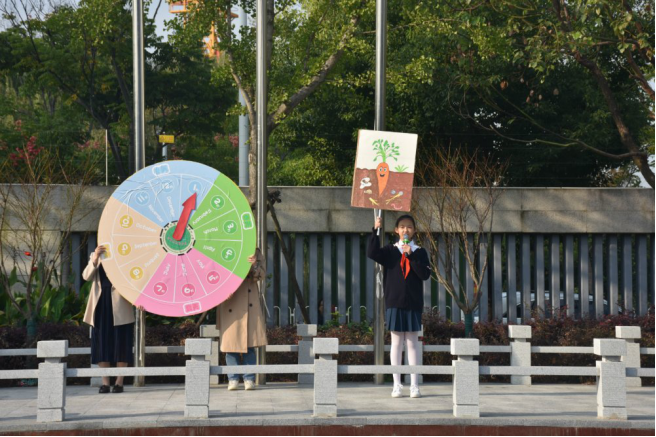 10月17日的早晨阳光明媚,二(7)班蔡灵曦、三(1)班李奕扬、三(4)班肖瑞琪、三(5)班王一格、三(8)班陶王梓、四(4)班葛悠然同学带着他们扮演的粮食向我们走来啦!他们向同学们仔细介绍了胡萝卜、水稻、红薯、土豆、南瓜一年四季的生长变化以及食用功效,同学们收获满满。