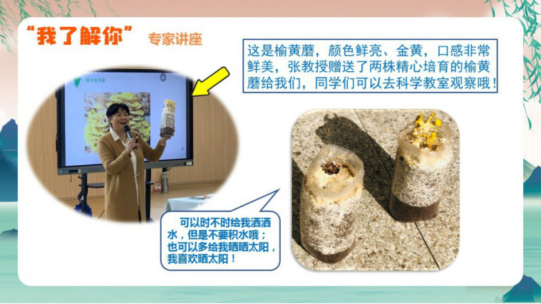 周三中午,一年级同学迎来了一场精彩的“蘑菇大秀”。南京晓庄学院药用菌物研究所所长、中国菌物学会药用真菌委员会副主任张李阳教授给大家带来了讲座“动动手、动动脑,种出漂亮的菌宝”。同学们跟着张教授认识了种类丰富的蘑菇,还近距离观察了虫草花,最后张教授还赠送了两株亲自种植的“榆黄蘑”给我们南外青奥村的同学们,大家在菌菇的知识海洋中遨游,也期待着榆黄蘑在我们小小青奥园里生出一茬一茬小蘑菇。