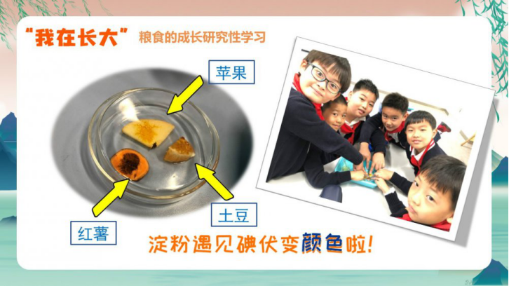 科学课上,我们开展了关于粮食的知识竞赛和研究性学习。马铃薯、红薯、苹果、杂粮馒头中含有淀粉吗?让“碘伏”验证一下吧!你们瞧,同学们实验做得多认真呀!原来,淀粉遇碘会变成蓝色,看来马铃薯、红薯和杂粮馒头中的淀粉含量可真不少呀!