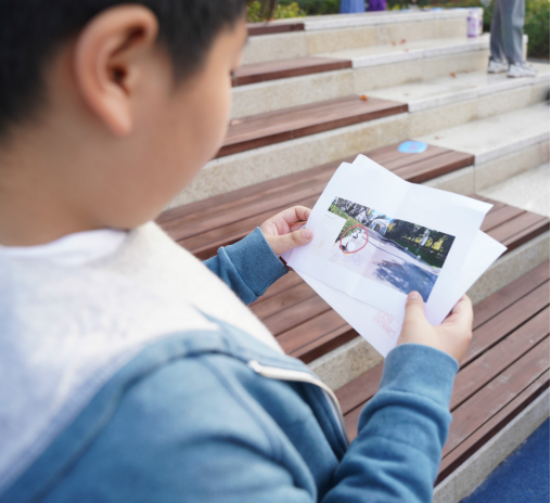 上午8点30分,活动以“寻宝游戏”拉开序幕。每个家庭得到一个任务信封,根据信封中所提供的线索照片,先寻找校园中对应的位置,再进行创意彩绘。