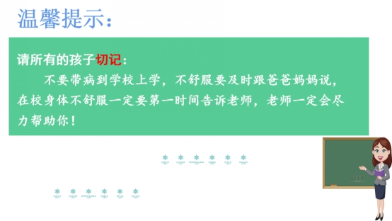 同学们,秋天天气逐渐变冷,我们的身体极易出现不舒服。如果你的身体有任何不舒服,不要勉强自己,硬撑着来学校,在家一定要第一时间跟爸爸妈妈说,在校及时跟老师描述自己的不舒服症状。这样家长、老师可以第一时间了解你的身体情况,及时给出在家休息或是去医院请医生诊断的建议。