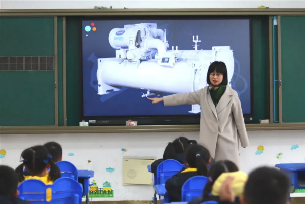 一(6)班梁瓒宁妈妈带着孩子们认识中央空调系统。通过展示家庭及大型建筑物中的壁挂式空调、地暖、制冷主机等各系统设备,介绍中央空调制冷主机的主要部件组成,以及产生冷量的原理。贴近生活的日常工作图也让孩子们对工程师这个职业有了新认识。空调在我们生活中必不可少,里面竟然藏着如此多的奥秘,孩子们为获得知识而欣喜不已。