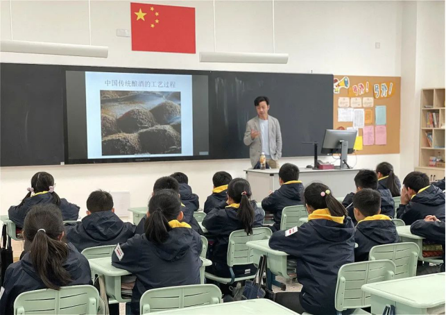 酒文化?也许你会说距离小学生太遥远啦!家长讲堂上,五(6)班任素斐爸爸就带着同学们走近酒文化,一探酒文化的魅力。素斐爸爸从唐代大诗人李白导入,引领同学们从古诗文中走进酒文化。随后任爸爸通过简单易懂的语言为同学们讲解白酒、红酒的酿造过程,通过一幅幅图片,带着同学们走进观江记酒庄的手工精酿车间、蒸馏车间、地下酒窖、罐藏酒库、灌装生产线、酒体研发中心、食品安全检测中心、酒文化展示体验中心,多角度了解白酒发展历史及其文化内涵。生动有趣的讲解中,孩子们走近了源远流长的酒文化!