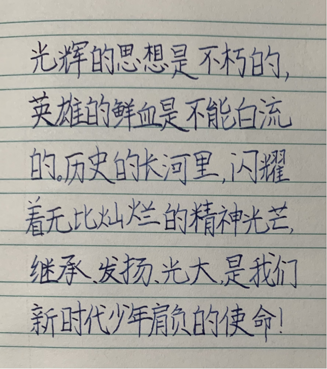 光辉的思想是不朽的,英雄的鲜血是不能白流的。历史的长河里,闪耀着无比灿烂的精神光芒,继承、发扬、光大,是我们新时代少年肩负的使命!
