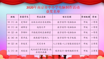 在2020年南京市中小学电脑制作活动中,我校获得4个市级一等奖、2个市级三等奖。获奖名单如下: