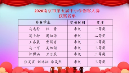 在2020南京市第五届中小学创客大赛活动中,我校共有6支队伍获得市级奖项。其中,马逸柠、杜晋获得市级一等奖,冯世轩、周知源获得市级二等奖,王睿晨、费锡宥、马一可、吴加锴、许博涵、卫若辰、张昊宸、刘姝翧、李晟熙获得市级三等奖。