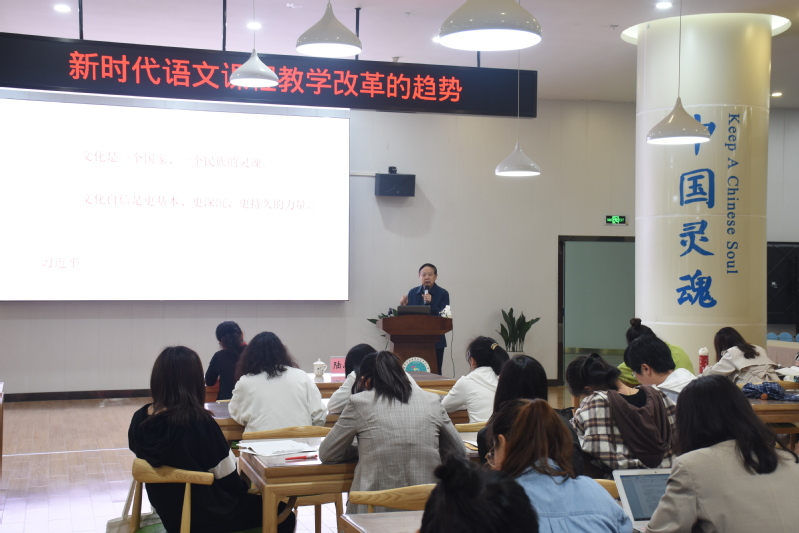 陆会长从“时代发展”和“融合创新”两方面详细讲解了新时代语文课程教学改革的走向。陆会长指出教育要随着时代的变化而变化,人文主义教育观要建立文化自信,发展面向行动的语言教学。通过古今对比、引经据典,多角度地诠释了语文课程的特点,他强调语文教学应追求工具性与人文性的统一,学生学习语文的过程是语文素养发展的过程,也是精神生长的过程。