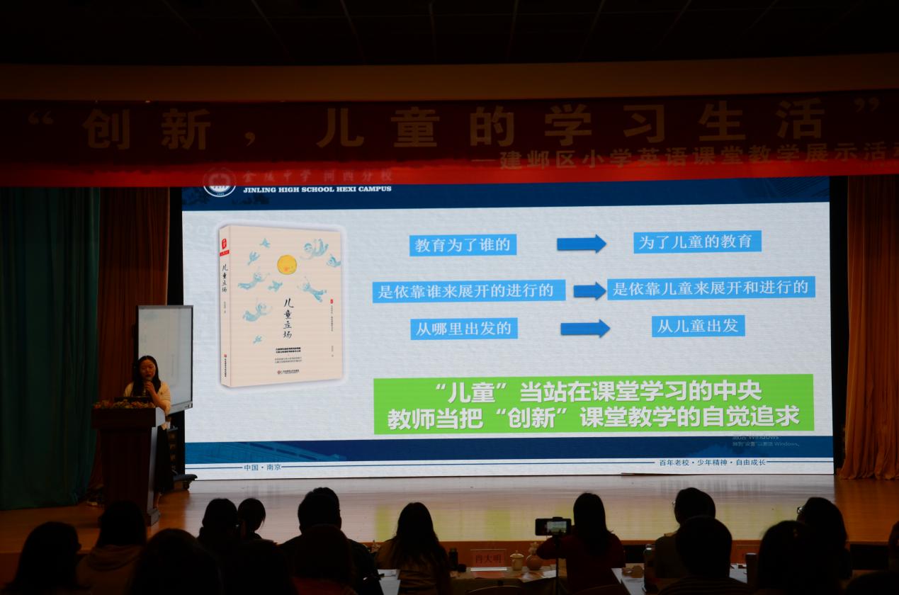 金陵中学河西分校小学部课程处华红娣主任在她的汇报中强调了“聚焦英语学科核心素养,关注教材主题语境”的重要性,提出“整体设计”举措。她倡导“向着儿童出发,构建基于儿童立场的英语课堂”,具体表现在:立足儿童立场,精心营造教学情境;链接儿童生活,巧妙设计思维活动;尊重儿童差异,分层设计练习作业;珍视儿童价值,致力涵养文化品格四个方面。