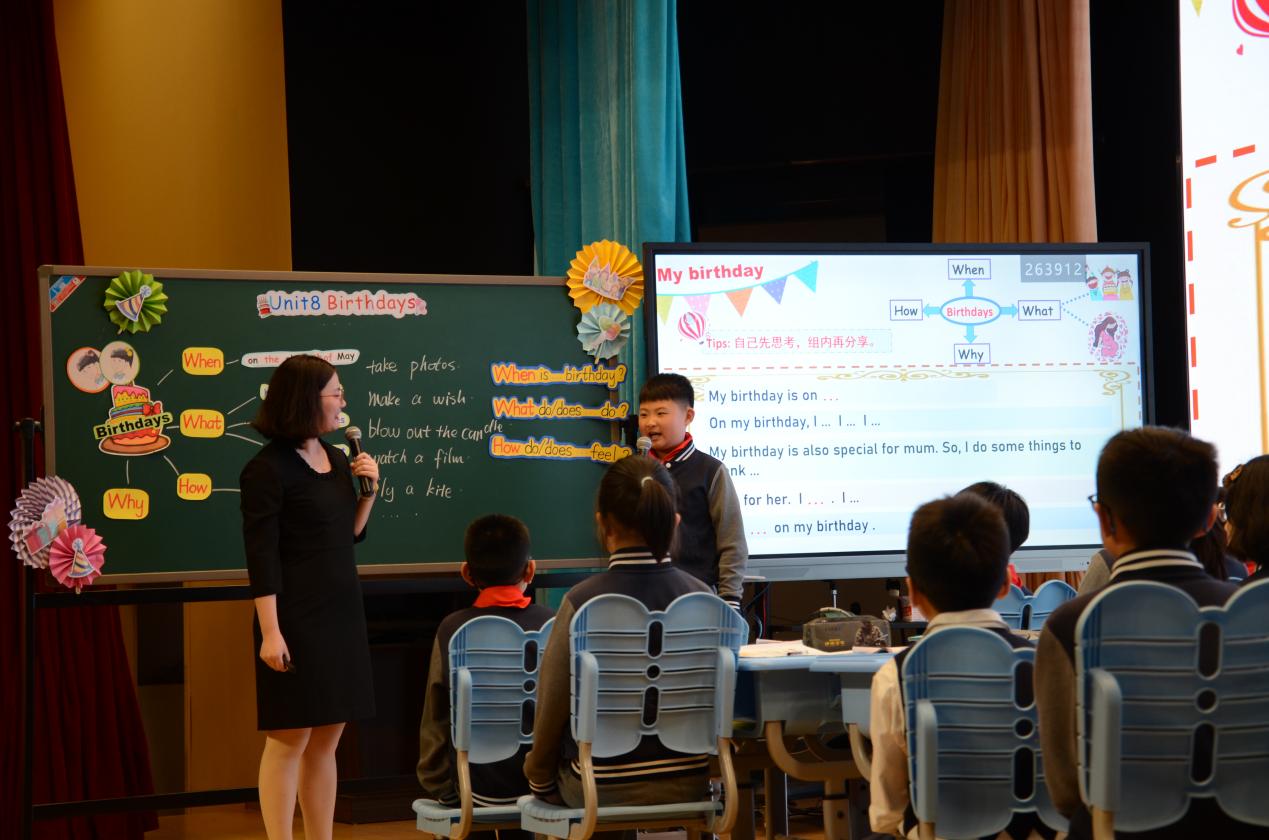第三节课由金陵中学河西分校小学部的祁慧老师执教,在五年级Unit 8 story time的教学中,祁老师通过歌曲为教学暖场,营造生日的语境。通过游戏拉近与学生距离,进一步导入课题。学生通过思维导图,交流观点、整理信息,语言综合运用能力得到了提升。最后,老师带领学生对比中西方生日的不同活动,体会多元文化,并引入绘本,激发对母亲的感恩之情。