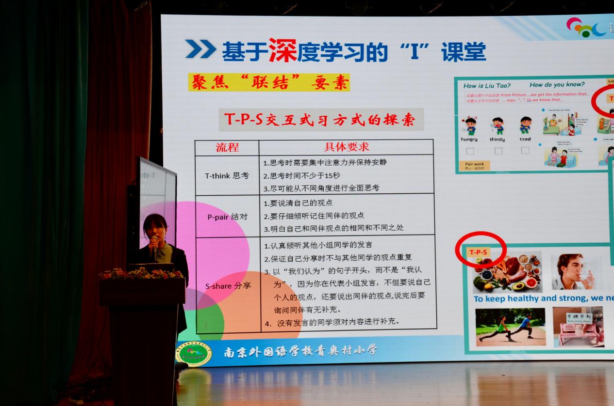 南外青奥村小学周培蓓副校长从基于深度学习的“I”课堂的五要素:个体(Individual)、沉浸(Immersion)、联结(Interaction)、启迪(Inspiration)、提升(Improvement)出发,分享了六个层面的课改创新主张。即:创新教学理念——研判学情、以学定教(聚焦“个体”);创新问题情境——资源统整、深度卷入(聚焦“沉浸”);创新学习方式——多元交互、多维联结(聚焦“联结”);创新表达方式——“有声”思维、精准表达(聚焦“启迪”);创新学习生活——追寻价值、内化行动(聚焦“提升”);创新课堂评价——以评促教、优化改进。其间她结合魏老师的课,向大家详细介绍了南外青奥村的英语课堂在优化教师的“教”和学生的“学”方面,研判学情“先学后教”、构建并实施“T-P-S策略”、不断优化学生学习样态等诸多实用、有效的创新性举措。