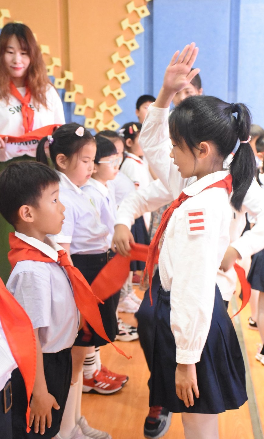 大队辅导员徐彤彤老师宣读新队员名单,一年级76名学生光荣加入少先队组织,老队员们为一年级新队员戴上了鲜艳的红领巾并互敬队礼。飘扬在胸前的红领巾,不仅是“少先队员”身份的光荣象征,更是引领着新队员不断前行的火炬。看着胸前飘动的红领巾,队员们脸上洋溢着激动与自豪。