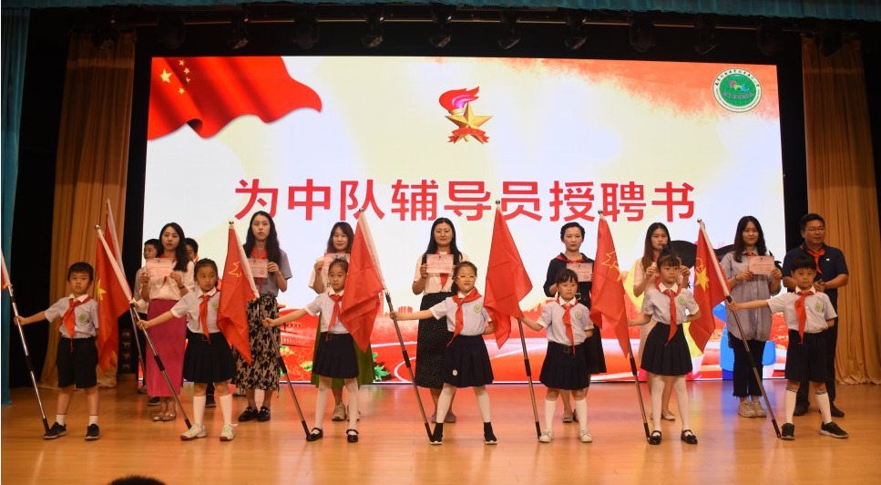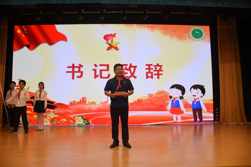 校少工委主任朱道亮书记宣布新成立的中队,随后,一年级各队员代表庄严地接过中队旗。朱书记勉励队员们,要从小听党话、跟党走,从小学先锋,长大做先锋,用实际行动为红领巾增光添彩,努力成长为能够担当民族复兴大任的时代新人。