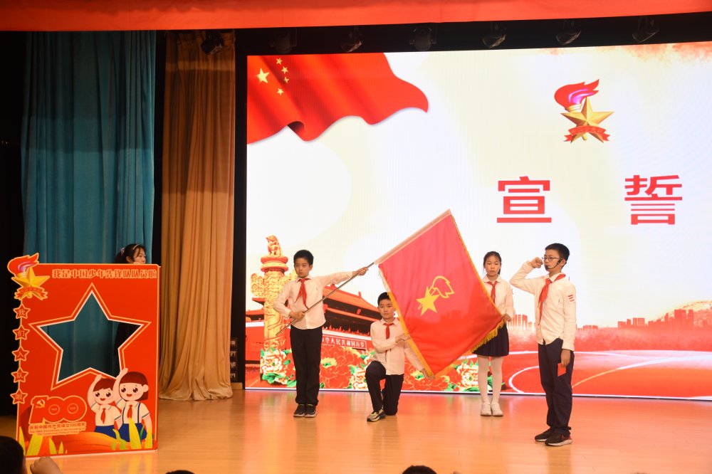 在鲜艳的队旗下,新队员们昂首挺胸,高举右拳,在大队长钱晋的带领下,庄严宣誓。坚定而幸福的眼神中透露出队员们内心的兴奋与激动;嘹亮而整齐的誓言彰显着队员们努力进取,不负使命的信心与决心。