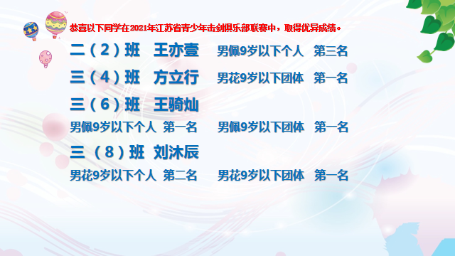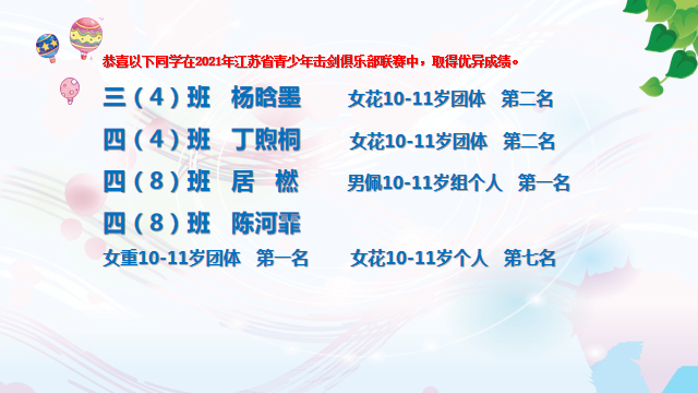 近日,2021年“德菲特”杯江苏省第二届中小学生击剑比赛暨江苏省击剑俱乐部联赛(第二站)圆满落幕!本次比赛包括重剑、花剑、佩剑三个项目,我校10名队员组成的代表队奋勇拼搏、超越自我,在团体项目中勇夺3枚金牌、2枚银牌,个人项目中勇夺2枚金牌、1枚银牌、1枚铜牌。