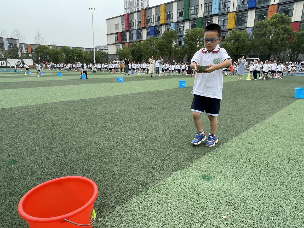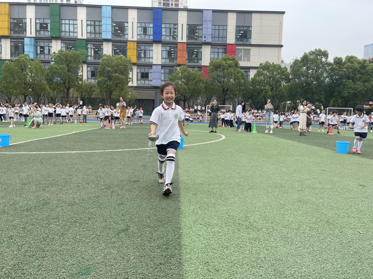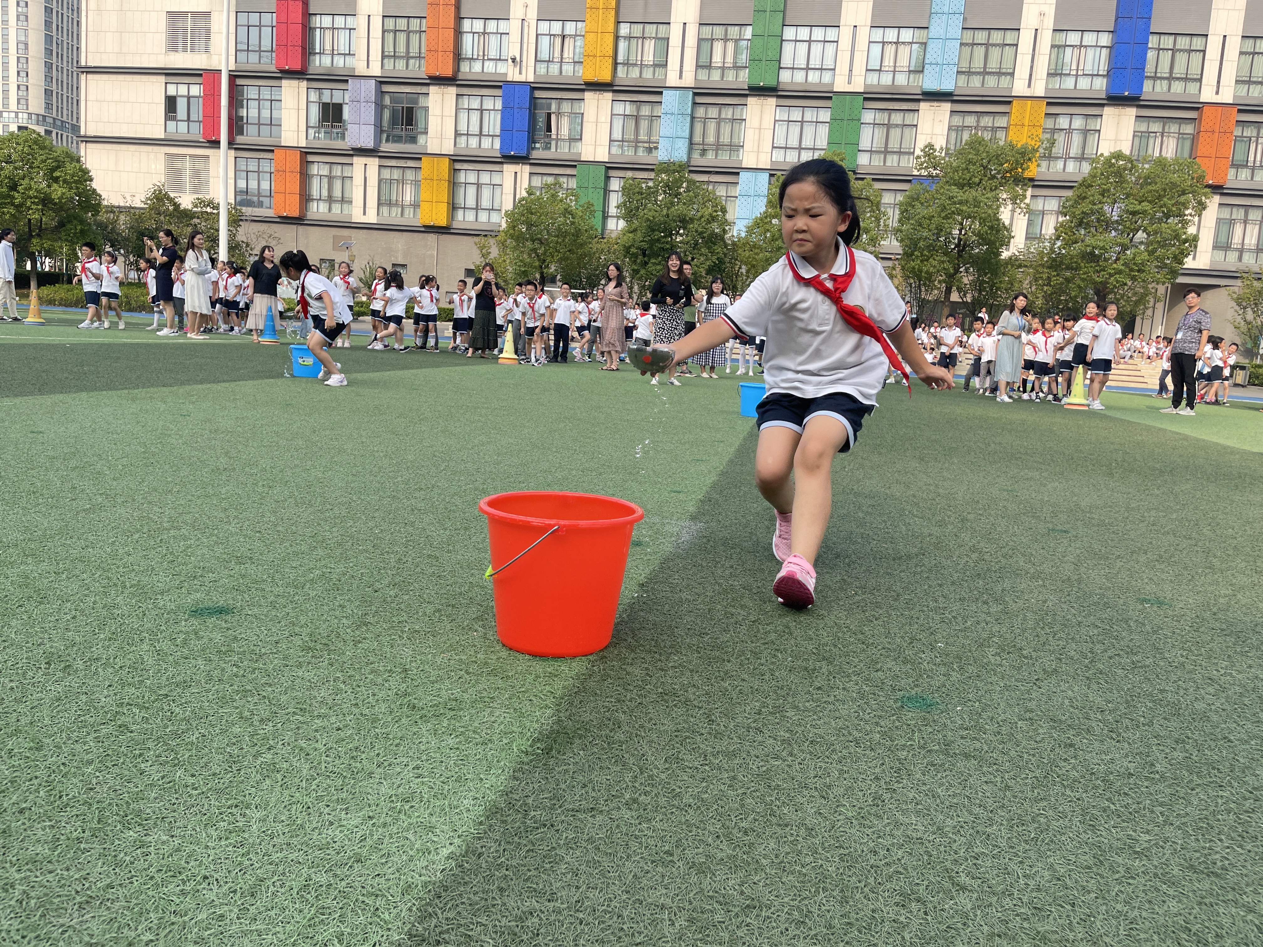 着裁判员一声令下,同学们如小火箭般冲了出去!瞧,他们迅速冲向第一个水桶,舀上满满一碗水后起身奔向第二个空桶为了让水尽可能多地留在碗中,小运动员使出了浑身解数