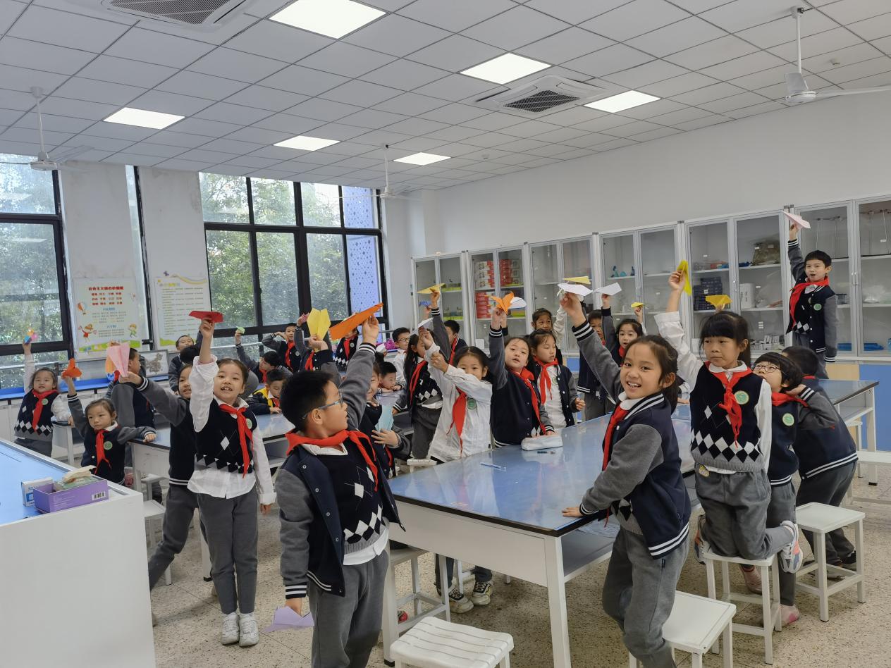 一架飞机究竟怎样设计才能飞得稳、高、远呢?一二年级的同学通过设计和比赛,发现飞机的结构、材料、机翼尾端弧度、重心、投掷角度等因素都会对飞行距离产生影响。各班级夺得前三名的同学和大家分享了从选材、折叠到飞行姿势的技巧,同学们吸取经验,下次一定能设计出精致的小飞机。