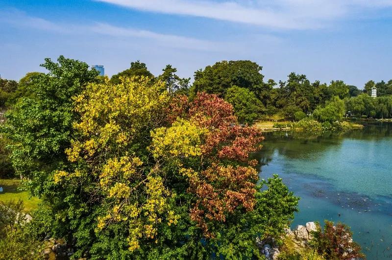 沿着美丽的湖边向里走,玄武湖的秋景色彩斑斓。极具古典气质的乌桕“打翻”了深秋的调色盘,集绿色、黄色、红色于一身,和湖石相得益彰,景观自然、生趣;伴随着菊花、桂花等相继绽放,银杏、木瓜、山楂、琼花果也挂满了枝头,尤其那火红色的小琼果点缀枝头,十分喜人;鸬鹚、绿头鸭等鸟儿也来到玄武湖越冬,这些可爱的“精灵们”或在林间枝头飞舞,或在多彩的树枝上栖息,总能带给孩子们惊喜。
