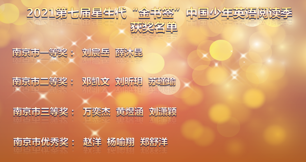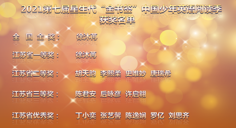 秋日暖阳融融,2021年度第七届星生代“金书签”中国少年英语阅读活动全国总展示圆满落幕。我校三年级7班徐沐苒同学从经历海选到参加市级选拔,从突围省决赛到进入全国展示,一路披荆斩棘,最终顺利荣获全国金奖!