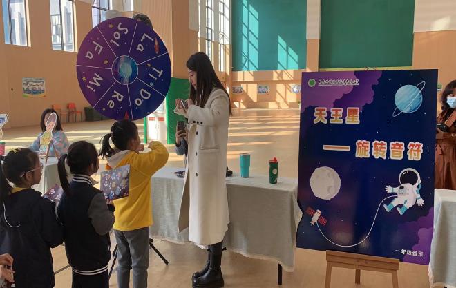 天王星上的音乐旋转大转盘大大吸引了同学们的眼球。同学们需转动转盘,在转盘静止后,从指针指到的音阶位置开始唱出相应的音符,并做出柯尔文手势。除此之外,他们还需要在小卡片上找到7个音符,给它们排序。其间,尽显出他们对曲调与音符的掌控力和记忆力,棒棒哒!