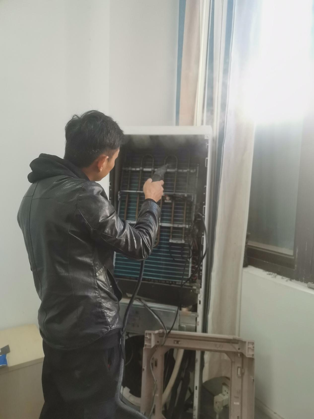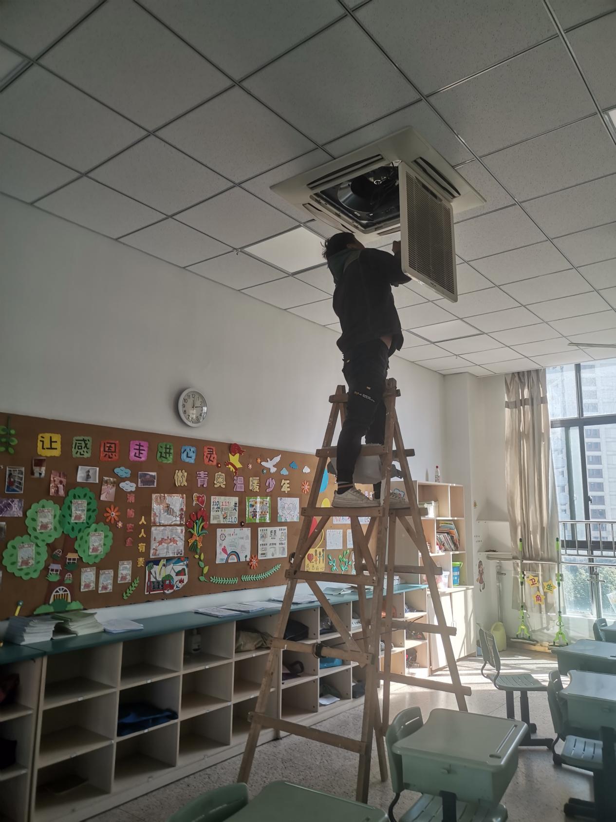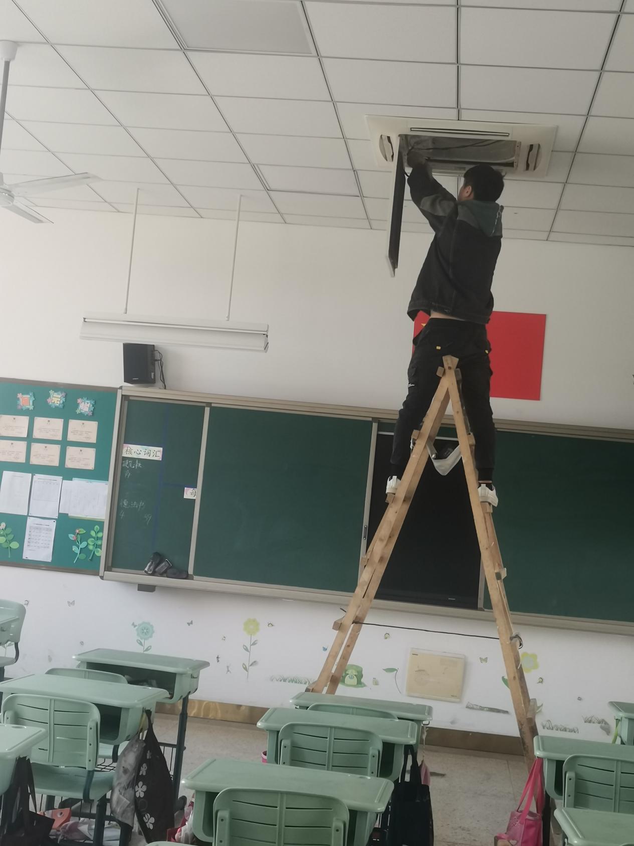 大家都知道学校属于人员密集的场所,尤其是教室,学生和老师的一举一动产生的扬尘、衣服纤维、飞沫,还有粉笔灰等,漂浮在空气中,会降低室内空气质量。这些粉末也会进入到空调内部,附着在过滤网上,如果长期不清洗,可能滋生细菌、病毒等。年龄小的学生群体或者抵抗力较差的师生,如果吸入了致病的细菌、病毒,可能引发呼吸道疾病,极易引起病毒二次传播,给师生的健康带来威胁。经过了一个夏季的使用,为了给全校师生一个健康、舒适的工作学习环境,我校聘请了专业工作人员对全校的空调进行大清理,为全体师生的健康护航。