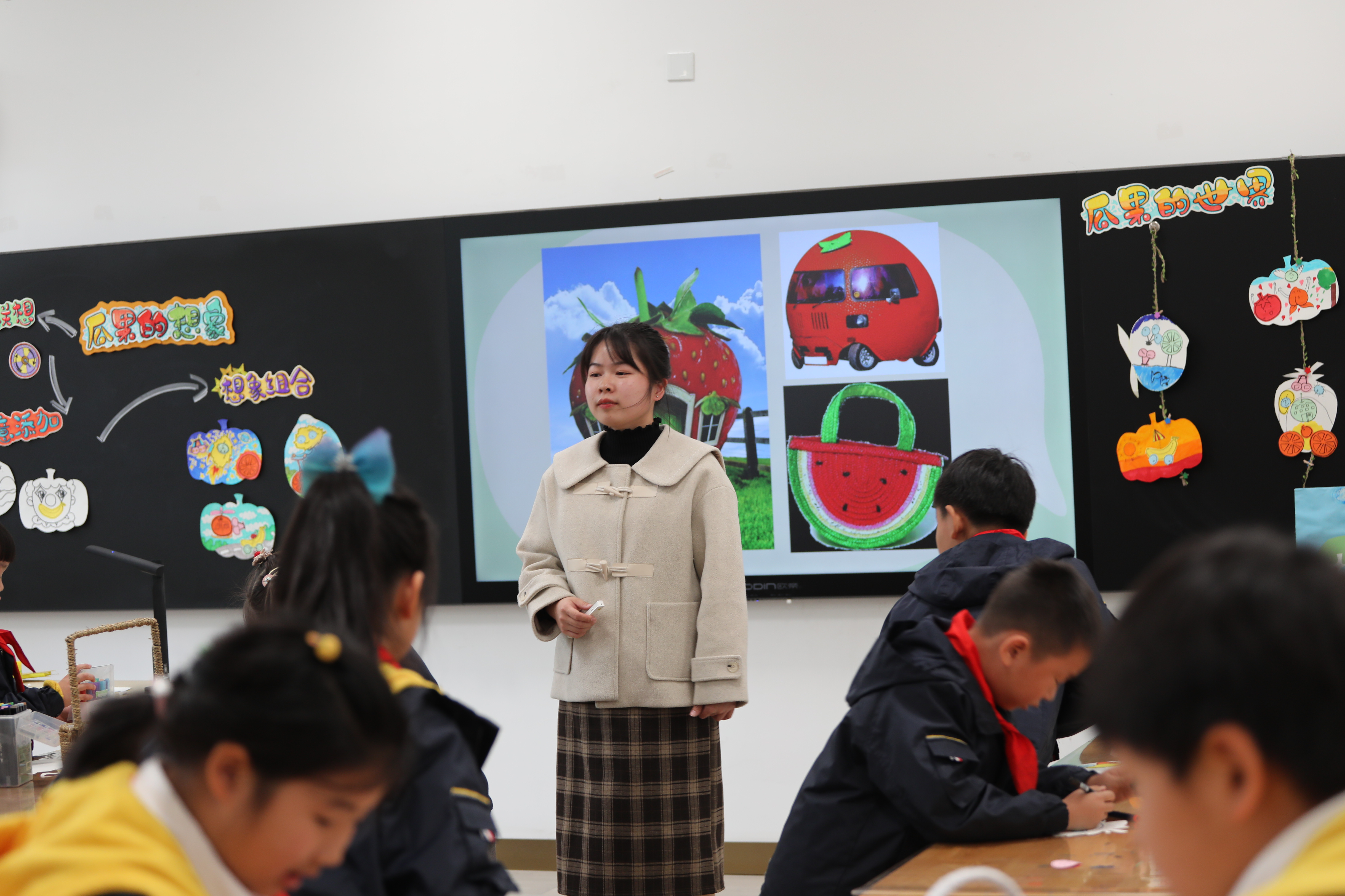 第一节展示课由南外河西一附小纪佳钰老师和我校邱钰景老师同时展示。纪老师执教的是《瓜果的想象》一课,她以一星、二星、三星魔法为主线,调动学生的学习热情,运用依形联想、创造添加、联想组合等方法引导学生亲历瓜果学习主题的探索过程,整节课由魔法情境巧妙串联,层层递进,最终有效达成教学目标。课上纪老师鼓励学生运用不同的方法,以自己喜欢的方式进行创作,她走近学生,关照每一个学生的学习状态,启发点播,让他们能在愉快的学习氛围中体验美术学习的乐趣。