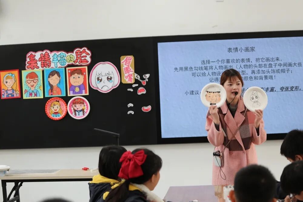 第二节展示课由致远外国语小学老师宋盈轩和我校孔祥涵老师同时进行展示。在《表情丰富的脸》一课中,宋老师以游戏闯关的形式,设置了四个“关卡”,让学生感受人物内心的情感变化,再通过五官的变化充分感受人物的“喜怒哀乐”。宋老师创设新颖的作业形式,将纸盘作为人物脸部让学生进行创作。学生当堂的作品,充分体现了他们丰富多元的思维与新颖颇具创意的表现方式。