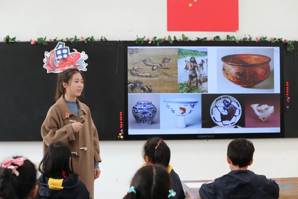 邱老师执教是《鱼》一课。一段沉浸式的电影《大鱼》音乐片断带领学生身临其境地走近“鱼”的世界。邱老师寓教于乐,通过呈现、讨论鱼的动态美,让学生了解了由古至今中国鱼文化的发展。她利用抽象、具象的绘画元素,允许学生自主选择自己擅长的方式添画鱼的内饰。整节课体现了教师以生为本的育人思想,邱老师充分尊重学生的认知差异,给予学生大胆想像的空间,鼓励创新,成功激发了学生的创作热情。