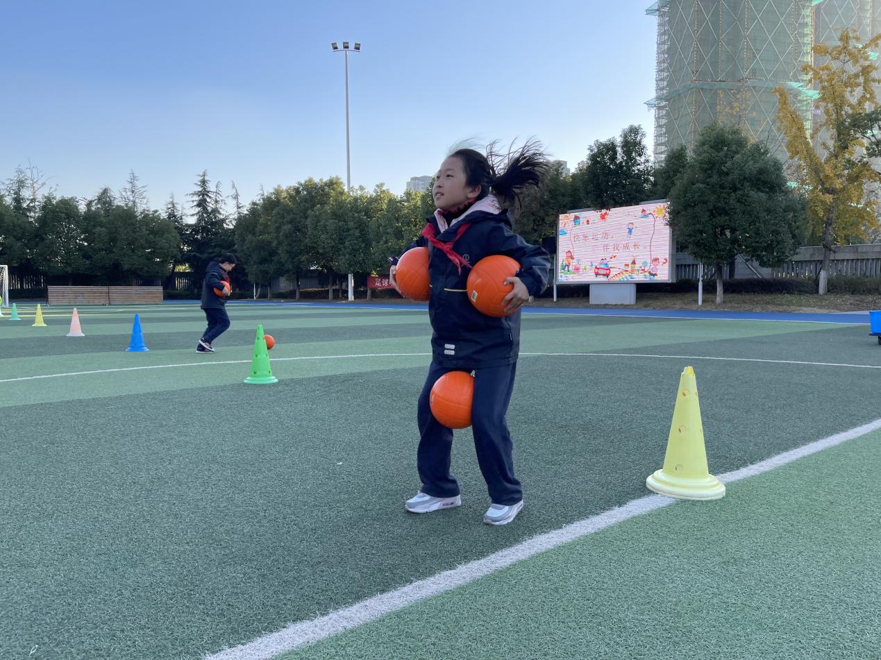 三、四年级的“企鹅夹球跑”发展了同学们的腿部力量和四指协调能力。