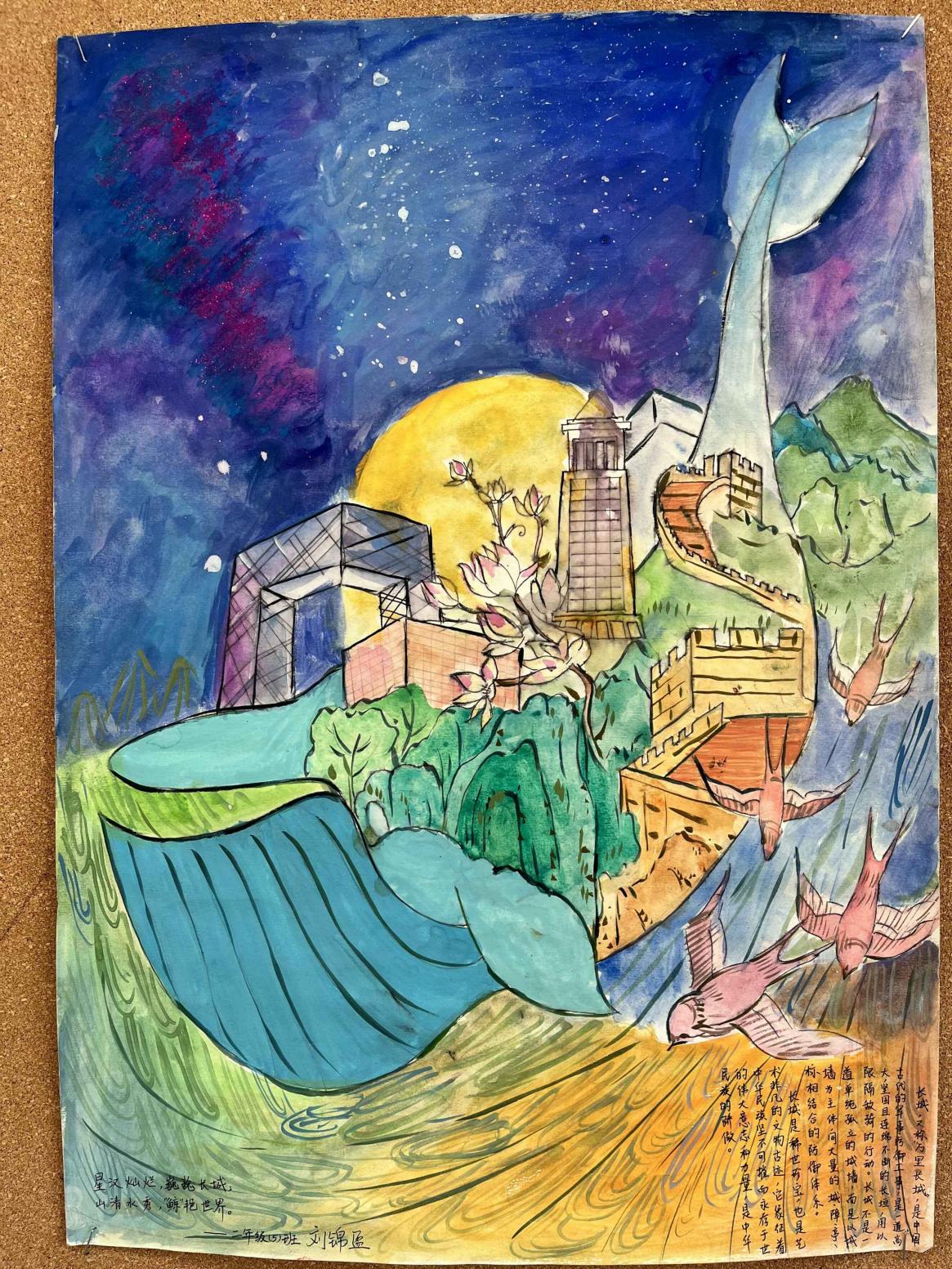同学们纷纷拿出自己精心绘制的图画,展现心中的大美中华。