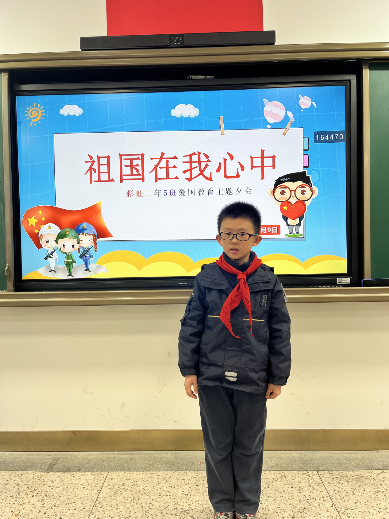 陈豫润和梁训铭两位同学在“彩虹知天下”栏目中展示了中国在军事、航空和外交上取得的成就,其他同学在听完播报后表达了作为中国人的骄傲之情。