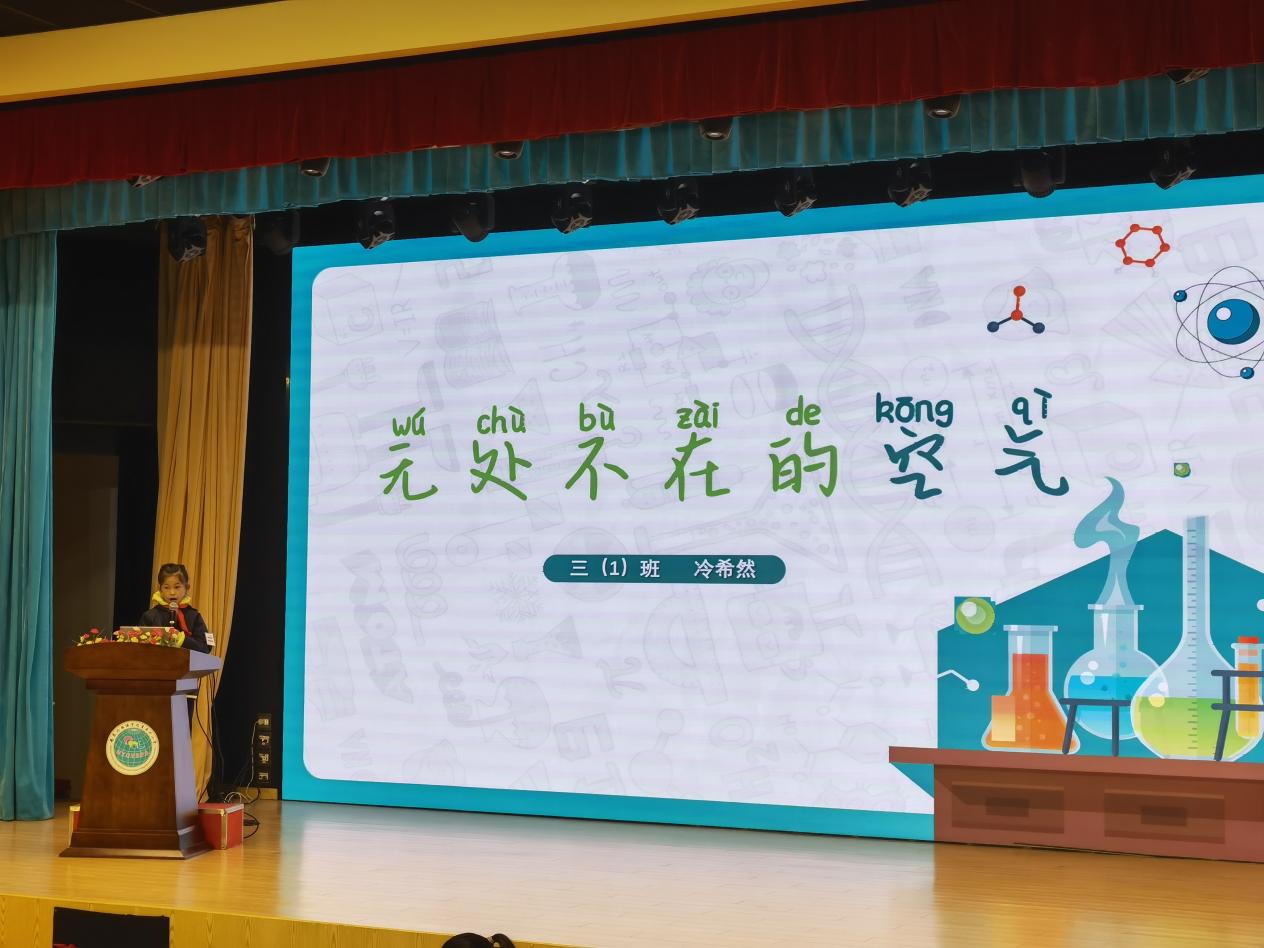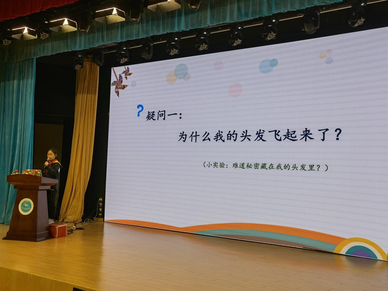 三(4)班的杨千逸同学利用自己的头发发现了静电的奥秘,还向大家介绍了生活中如何避免静电,以及静电的危害和重要作用。同班的冯士轩同学分享了“当可乐遇上曼妥思”的变化,他通过对比实验,更直观地了解到可乐里含有很多的碳酸成分,喝多了会伤害我们的身体。