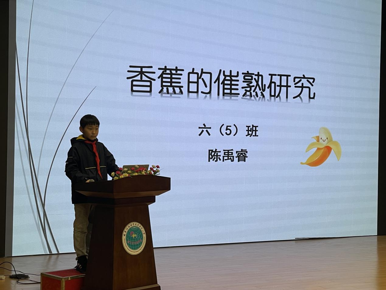 六(5)班的陈禹睿同学通过两组对比实验对香蕉进行了催熟研究,不仅学习到了新知识,还认识到科学具有严谨性,为得出正确结论还需要坚韧不拔的毅力。