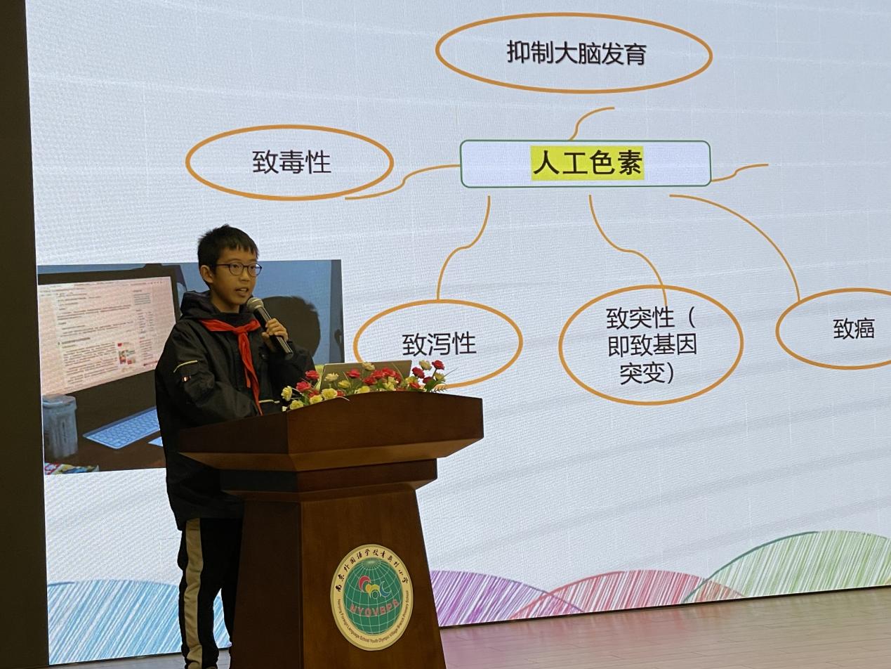 六(4)班的佘政吉向同学们通过对比工业色素和人工色素,向大家介绍了工色素的危害性。