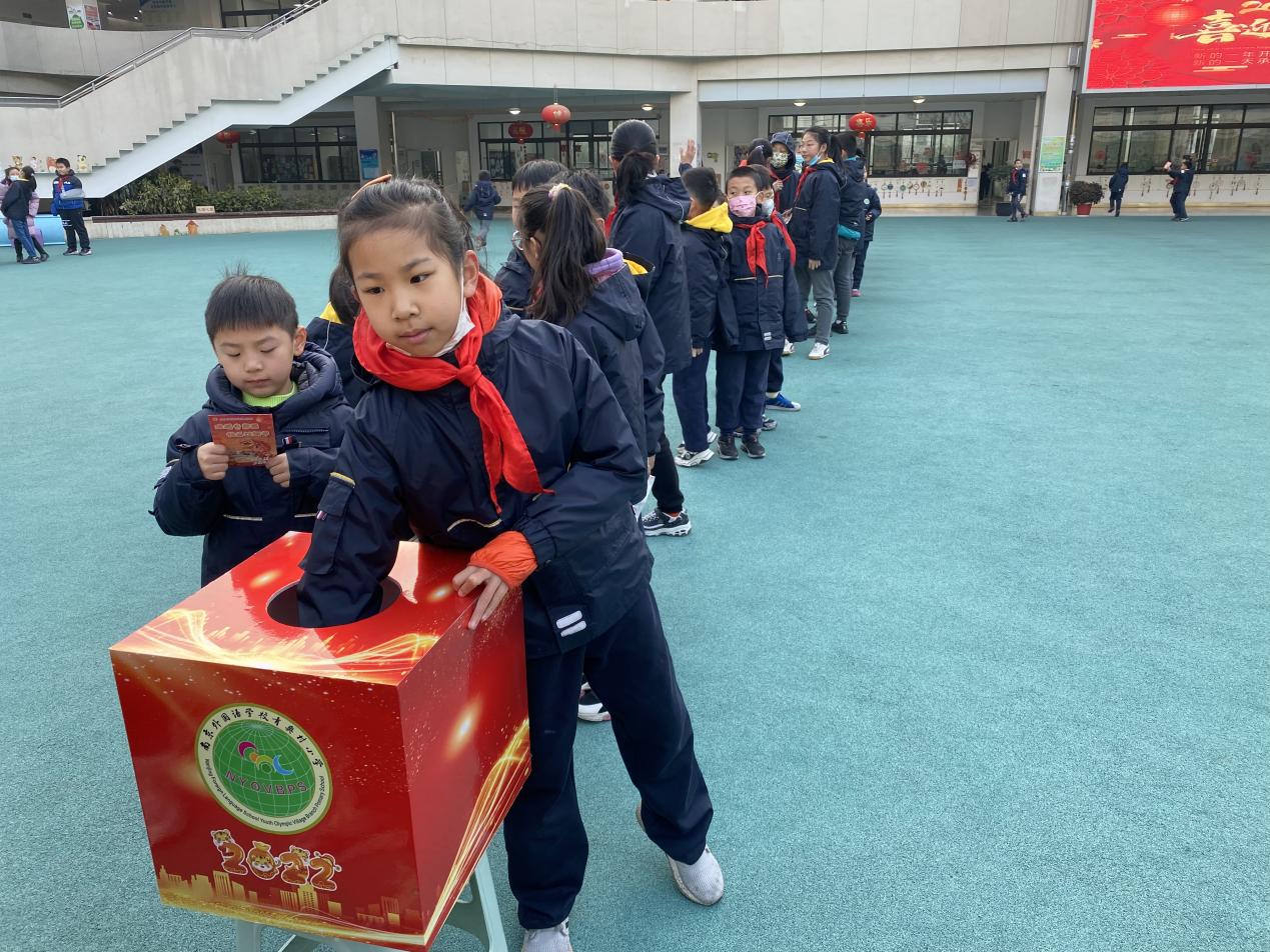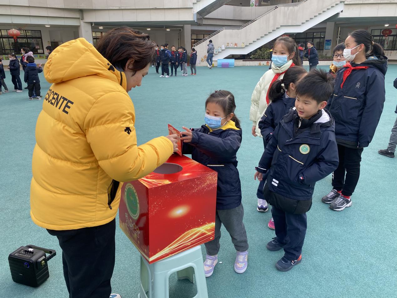 二楼平台上排起了长长的队伍,同学们的脸上洋溢着幸福的笑容,兴高采烈地从抽奖盒里抽取祝福贺卡,这些贺卡上有全校所有老师对同学们的祝福,祝愿他们在新的一年里身体康、品德端、学习棒。