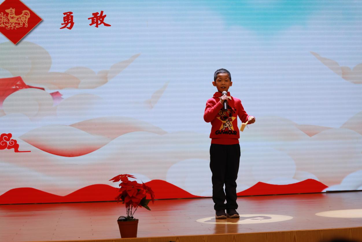 勇敢:2021我们见证很多勇敢的英雄榜样:为保卫国家献身的戍边战士、在疫情中坚守岗位的抗疫英雄、奥运赛场上为国争光的奥运健儿、筑梦太空的航天英雄。这些闪闪发光的榜样,都在告诉我们:中华民族一直都是个勤劳勇敢的民族!新的一年里,祝大家都能敢于创新、敢于拼搏、敢于尝试、敢于担当,向榜样们学习,做一个虎虎生风的青奥好少年!——丁煦桐