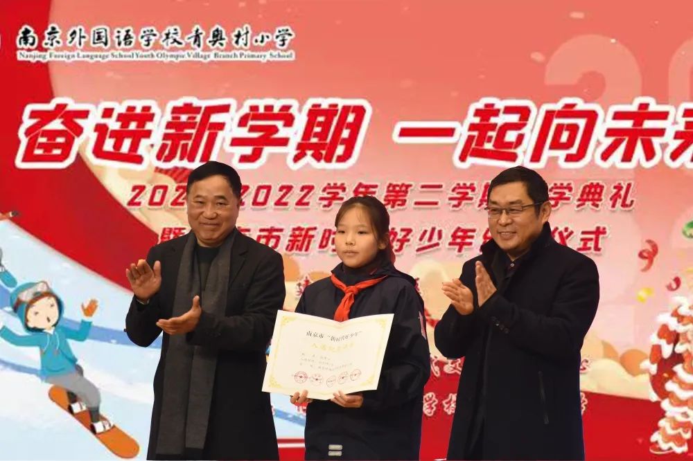 活动现场,建邺区区委宣传部副部长、文明办主任赵敬之和建邺区教育局副局长马峰上台为我校五(5)班的张译心同学颁发南京市“新时代好少年”证书。