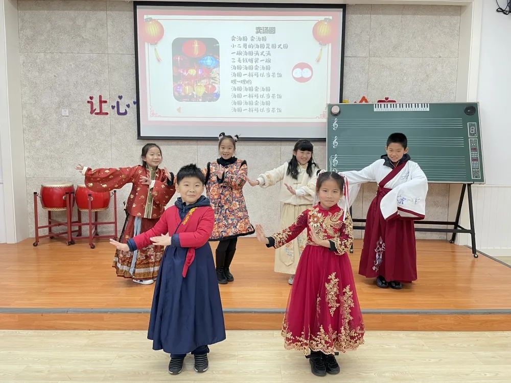 音乐课上,《闹元宵》《卖汤圆》……孩子们在表演中感受歌曲的律动体验节日氛围。
