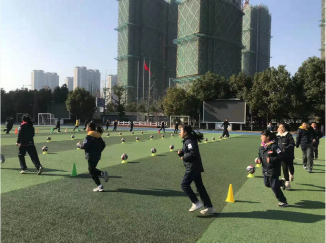 韩老师首先带领学生复习直线运球的动作要领,接着体验了右手运球逐一绕过标志桶,再过渡到左手运球体前变向,逐步挑战完整的曲线运球路线。学生们在一步步的练习中逐渐掌握了曲线运球的技术。