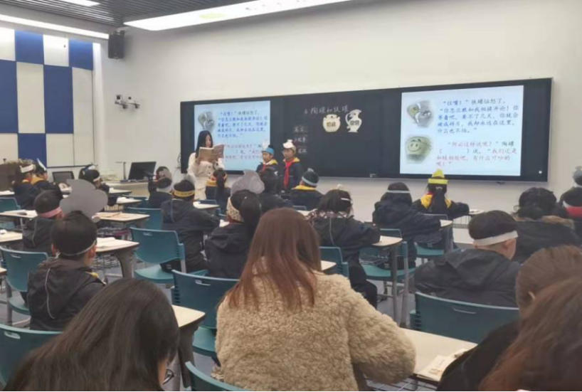 余老师的《陶罐和铁罐》一课,紧扣“读—悟”这条主线,以读促悟,引导学生们进行多种形式的朗诵。每个学生都戴上了与课文内容相关的头饰,让学生身临其境,领悟寓言背后的深意,形成对故事的多重维度的理解。