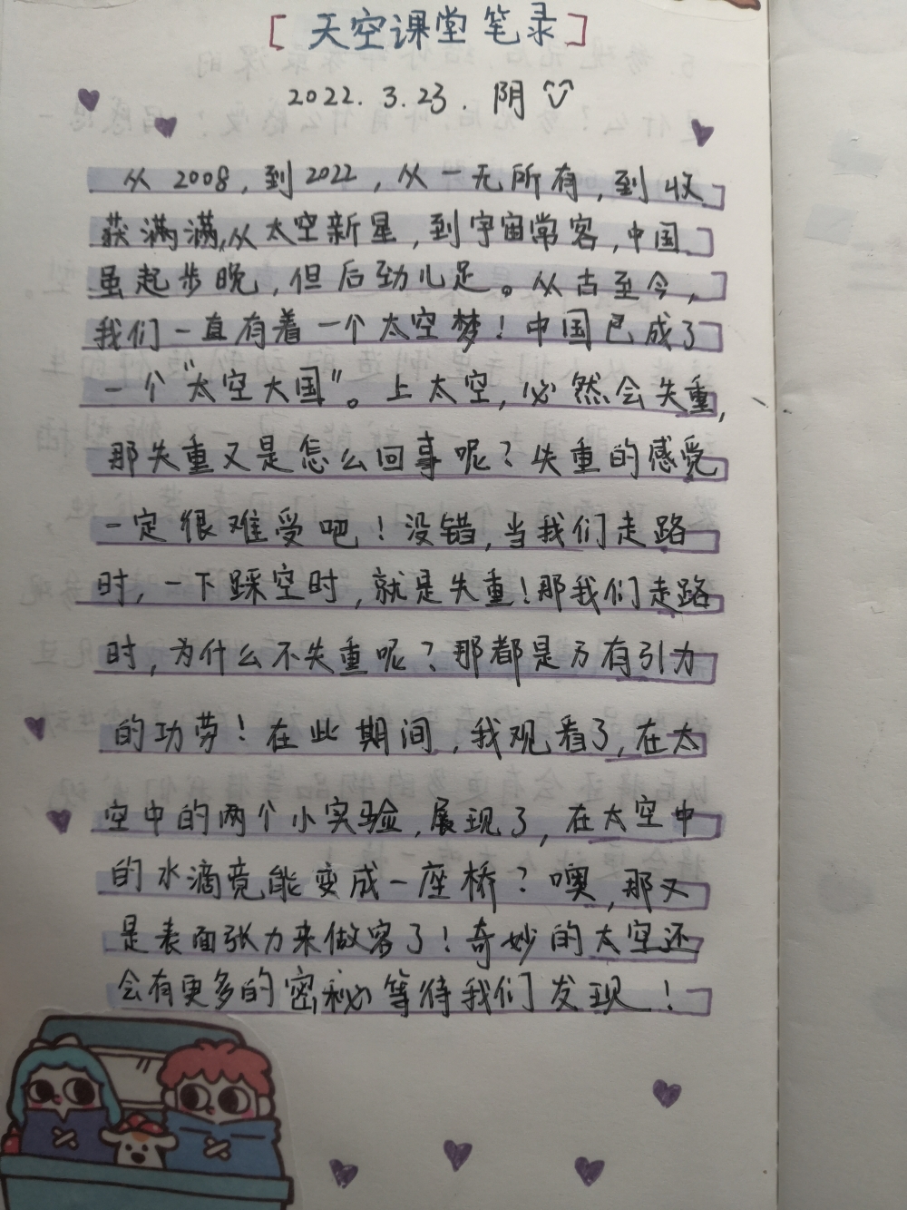 九天揽月,谈笑凯歌。人类对太空的向往和探索从未止步。几位航天员挑起科普重担,为我们设计和讲解了有趣的空中课堂,让科学知识在他们的讲解下变得通俗易懂。向各位宇航员致敬!也祝愿祖国更加繁荣昌盛!