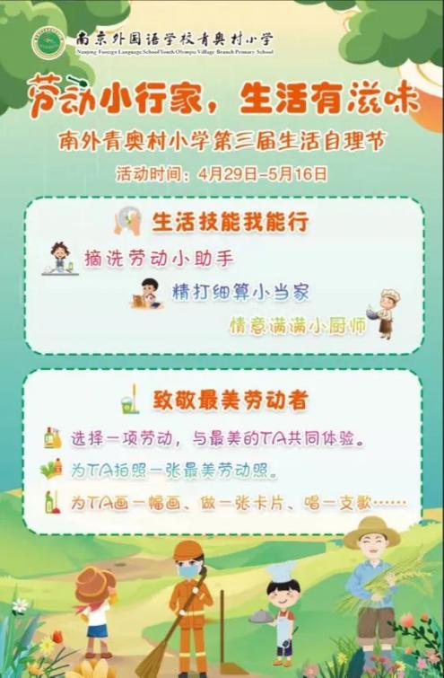 生活自理节期间学会的技能、劳动的风采、快乐的体验,可以通过文字、照片、视频等形式记录下来,上传到班级群中,优秀的作品将在学校公众号推送,快来参与吧。