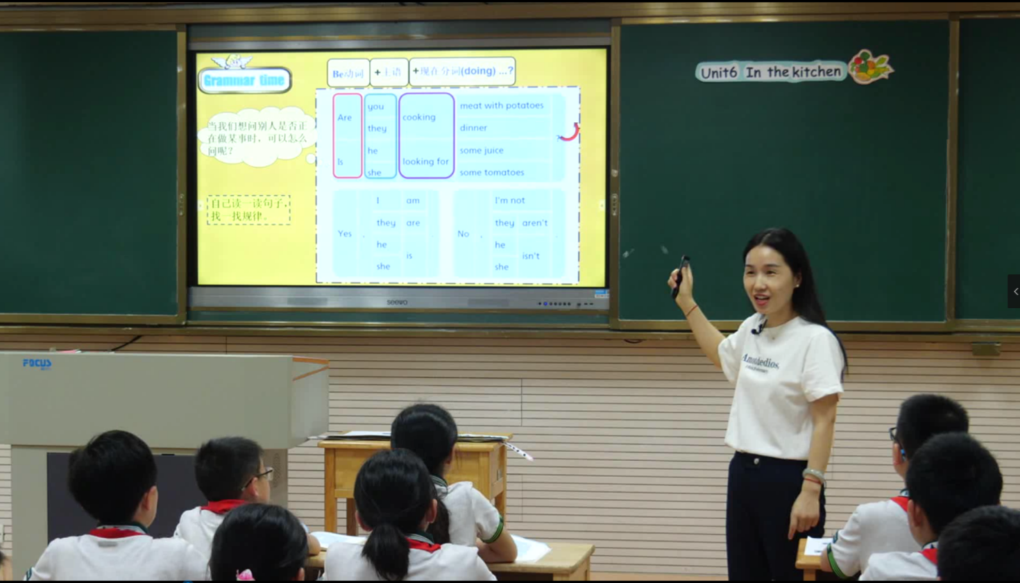 随后展示课例的是来自南师附中黄山路小学的杨晶老师执教的Fun time 和Grammar time板块教学。杨老师从学生的生活实际——谈论早餐食物出发,带领学生回顾刘涛一家晚餐前的厨房cooking情节,聚焦本课语法知识点——现在进行时态的一般疑问句用法,再以绘本《Little Mouse Honey》内容操练语法知识,以有趣的Fun time游戏,加深对所学语法概念的理解。其间杨老师放手让学生在实际操练中发现规律、提炼要点、总结规律,让学生的学习能力、语言综合运用能力得到发展。