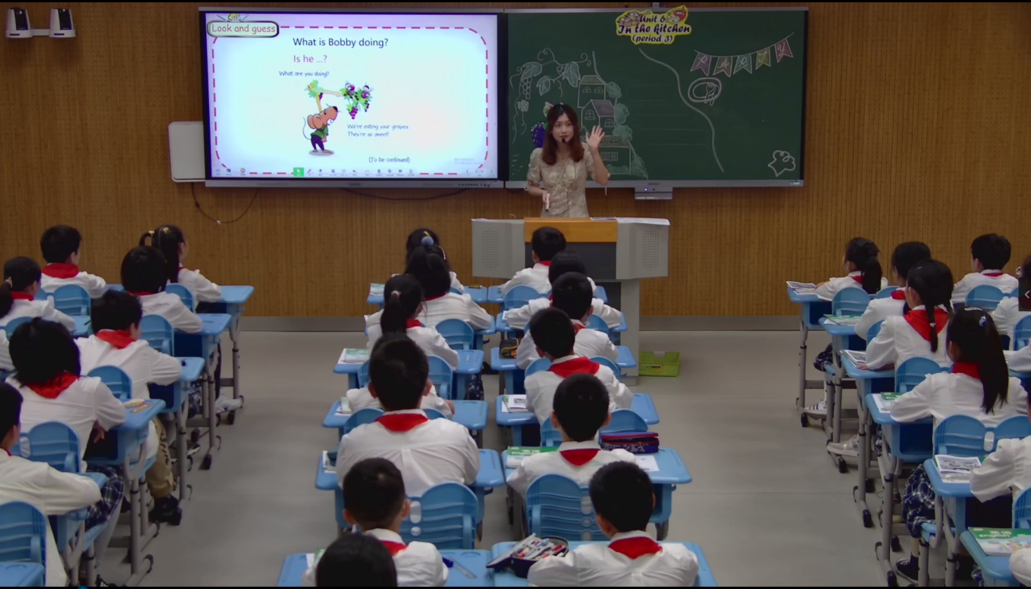 最先进行展示的是我校余慜老师所执教的《英语》五年级下册第六单元 Story time板块教学。余老师以现阶段学校正在举行的“生活自理节”为切入点展开话题,成功联结学生先前所学doing housework等语言知识,并由此引入In the kitchen单元主题。