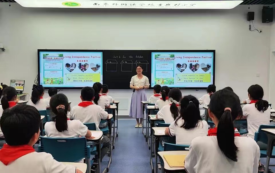 最先进行展示的是我校余慜老师所执教的《英语》五年级下册第六单元 Story time板块教学。余老师以现阶段学校正在举行的“生活自理节”为切入点展开话题,成功联结学生先前所学doing housework等语言知识,并由此引入In the kitchen单元主题。