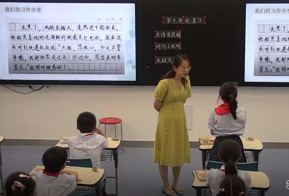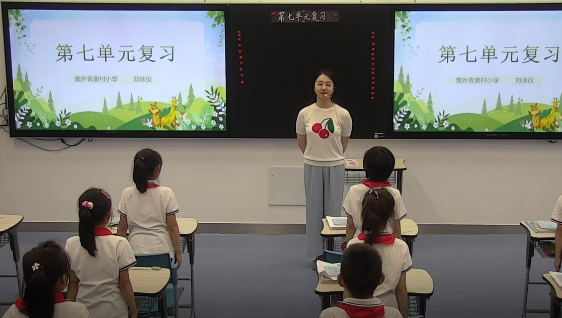 我校袁圆老师以四下语文第七单元为例,给大家带来了一节别开生面的复习课。本课以本单元的单元导语和单元目标为主线,分为古诗百花园、词句小天地、文段交流会三大板块,通过猜一猜、说一说、写一写等多种方式,梳理本单元的诗、词、句知识,品析文章中的重点语段,拓展课外的阅读片段,进而联系生活的实际,运用语言、动作、神态等细节描写的方法,写写我们身边默默付出的人。课堂上交流时,孩子们兴趣盎然,积极发言,开放、自信的思维品质在这里展现。