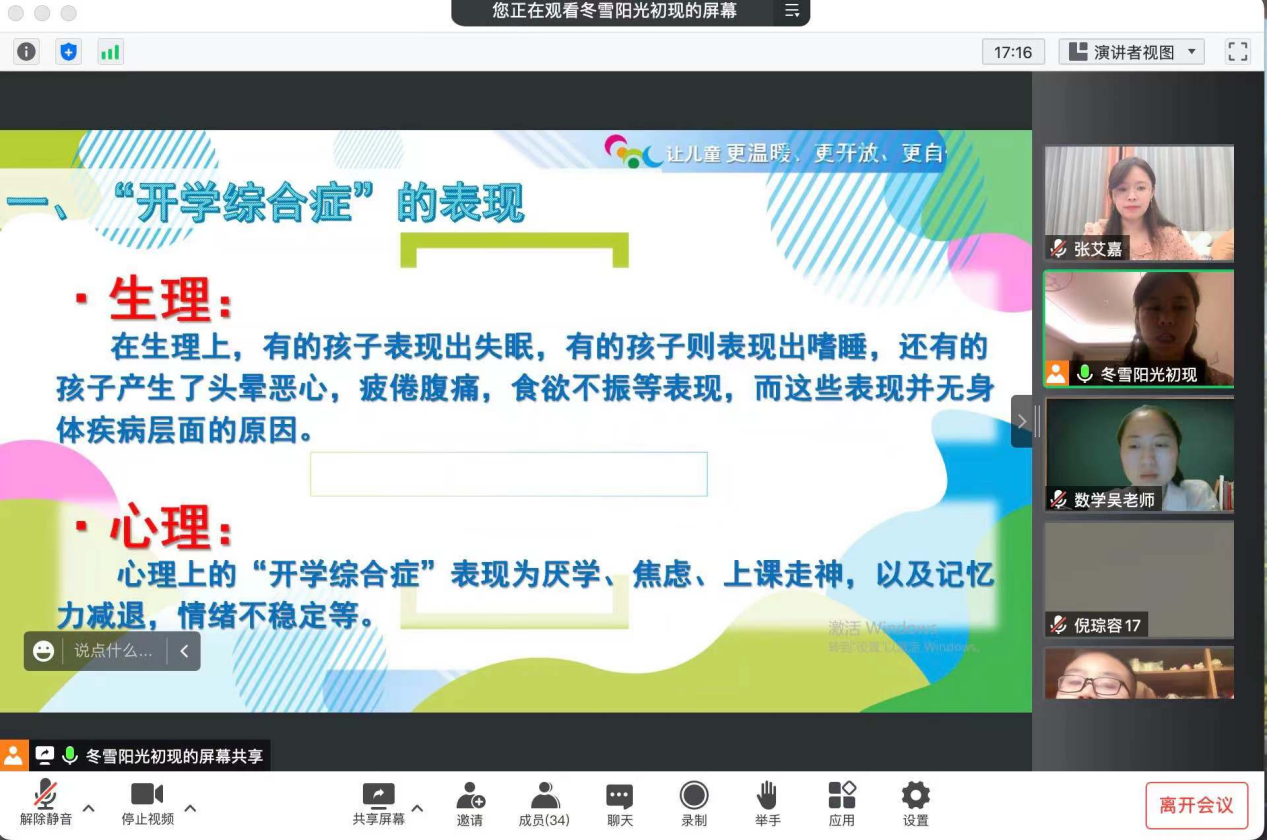 会上,老师们针对五年级学生开学前容易产生的状况给予了专业的指导,引导孩子们尽快找到学习的状态,从“防疫防控”“心理疏导”“学习准备”等方面与家长进行沟通,以良好的精神面貌迎接新学期的到来。相信,新学期孩子们能在家校合力中健康成长。